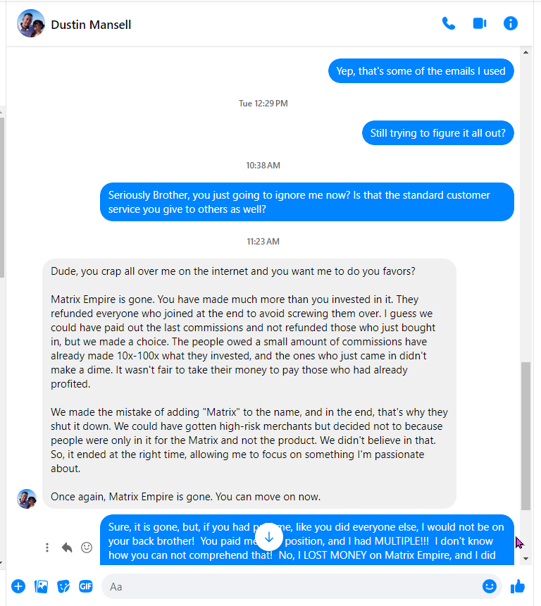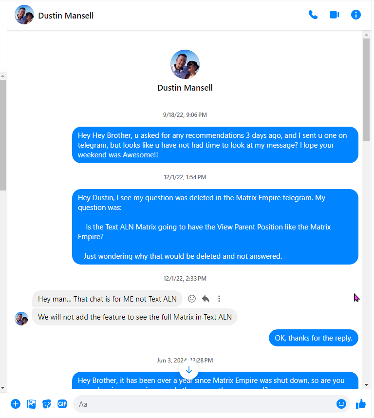 Here is my Credit Card Statement, with blocked out info that does not pertain to TEXT ALN, or MATRIX EMPIRE with the Serial Scamming Dustin Mansell from Las Vegas, NV so you can verify the charges, and the dates. CLICK HERE My bank statement does not go back far enough to get any of those charges, and my wife does not want her card up here, which there were not that many on her card anyway. She does not like it when we get scammed, and would rather hide in a hole and go on. I understand that, as that is the way I used to be, however, I have just been scammed way too many times, and now I am no longer embarrassed, and I am EXPOSING THESE SCAMMING FRAUDSTERS! Several Serial Scammers are already in Prison, and I have a Few More To Go! Mr. Mansell says I was paid back 10X-100X of what I INVESTED, as you will see in the Facebook Chat snap shot below! Odd, he cheated me down to a Single Text ALN Position, and paid me a bit over $500.00. So, lets see, if I had Earned Back a 10X INVESTMENT, then I should have been paid at least $5,000.00 on the amount that I was OWED, and if I had really hit the 100X INVESTMENT RETURN, on what I was owed, then he would be paying me $50,000.00... However, we know that when you INVEST, then it is 10X, or 100X your INVESTMENT! So, $2,038.00 X 10X would be - $20,380.00! So, a 100X INVESTMENT RETURN would have been a total of - $203,800.00! Yes, that would be a Really Nice Return on Investment! However, as you can see, the Low Life Serial Scammer Dustin Mansell is also a Pathological Liar... And does not understand investing, or how to pay people what they are owed, ON TIME, which you will also see in the "COURT SECTION" below! You will see below he said he also feels bad for taking some ones money there at the end. LOL Believe me, he sure does not feel bad, and as far as refunds, I never saw one of those either, and I seriously doubt that the Pathological Liar refunded ANYONE! He actually kept charging one ladies account that I know of, even after HE CLAIMED HIS STRIPE ACCOUNT WAS SHUT DOWN! Scammers Simply Lie, and Take the MONEY GRAB, and then make excuses, as you will see in the other chats, and videos.