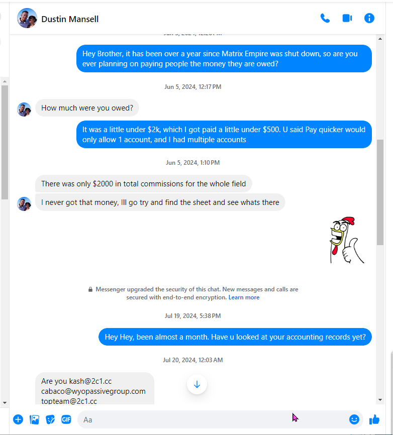 This video series is rather long, and then again, so it the Scams that Mr. Mansell has pulled on thousands of people! He uses his Whole Family to pull these scams off, which is a shame to be that type of role model to your loved ones. Below you will find images of our Facebook and Telegram Chats, and a list of Scams that I have found that Mr. Mansell has pulled and/or participated in, over and over again. There are Short Term Scams that Mr. Mansell knew it was a Scam, however, Mr. Mansell is there for the Money Grab, just like all Scammers! Once a Scammer, Always a Scammer, and they sure hang out in the same areas and seem to promote the same Scams over and over and over... You will also see some interesting Court Documents, and a hint of other Police Records! Mr. Mansell owes me nearly $2,000.00 in skipped commissions, as we "INVESTED", as Mr. Mansell says, just a bit under $4,000.00, and he tells me to simply "Move On"! LOL Seriously? Sure, easy for him to tell me to move on, as he has my money, and money of other people. I am wondering what Mr. Mansell would be saying if it was ME that Owed Him nearly $2,000.00 in skipped commissions? What if he had INVESTED Nearly $4,000.00 in my companies? Would he be Excited to Just Move On? Funny how Mr. Low Life Serial Scamming Dustin Mansell Claims that I made 10X to 100X of what I INVESTED! Well, you will see through out these videos, I Lost A Lot Of Cash with this Serial Scammer! Since I INVESTED a tad under $4,000.00 on my credit cards, and that does not include my wife's credit card, or our debit cards, than I should have earned back at least $40,000 if I got the minimum of 10X like Mr. Mansell Claims! Lets see, so 100X my Investment of $4,000.00 = $400,000.00, correct? Yep, almost a Half Million Bux! Mr. Mansell is a Serial Liar as well, which is proved over and over in the videos, and the chat sessions. He says over and over that his Stripe Account was shut down, which he had it shut down before, because he knew he could not use it for a MLM Opportunity, A Scam, or a Pyramid Scheme, however, he just used it until he was shut down and tells everyone "Sorry about that, Move On"! I find it odd that he continued to charge other peoples credit cards, even after he claimed his Stripe Account was "Shut Down", and refused to cancel their memberships in a company that he "Shut Down", not that Mr. Mansell wanted to shut it down, however, simply because he HAD TO, as He Could Not Qualify For A Real Merchant Account to keep it going! Seriously, if you are making really good money as he claimed he was, would you shut down a Profitable Company? No, of course not - Not in a Million Years! However, when you have poor credit, and court records, then you are not going to qualify for a merchant account, as the merchant account provider is simply not going to trust you, so therefore, Mr. Serial Scammer Dustin Mansell had no choice but to shut it down. He said something to the effect that it was time to shut it down, and you and I both know, it must have been killing hIm to shut his Two Babies down, as he like to call them. I will do more digging, and I would not be surprised if I find a police record on this guy... Enjoy the video series, and the images below, and please, if you have been Scammed by this Serial Scammer, don't be embarrassed, just make your complaint on this site, and pass the link around to others so they can make their statement as well, https://wyopassivegroup.com, and check out the blog on where to send in your victims statements to the proper authorities, as they will be "PRIVATE & Not PUBLIC", as this Serial Scammer needs to be behind bars... I have made a few mistakes in this video production, as I researched and worked on it part time for months, and got a few things reversed and/or duplicated, however, I am not going to go back and change them, as The Low Life Dustin Mansell Knows he owes me the money, and other people as well, so we all need to put in our statements to the proper authorities. |